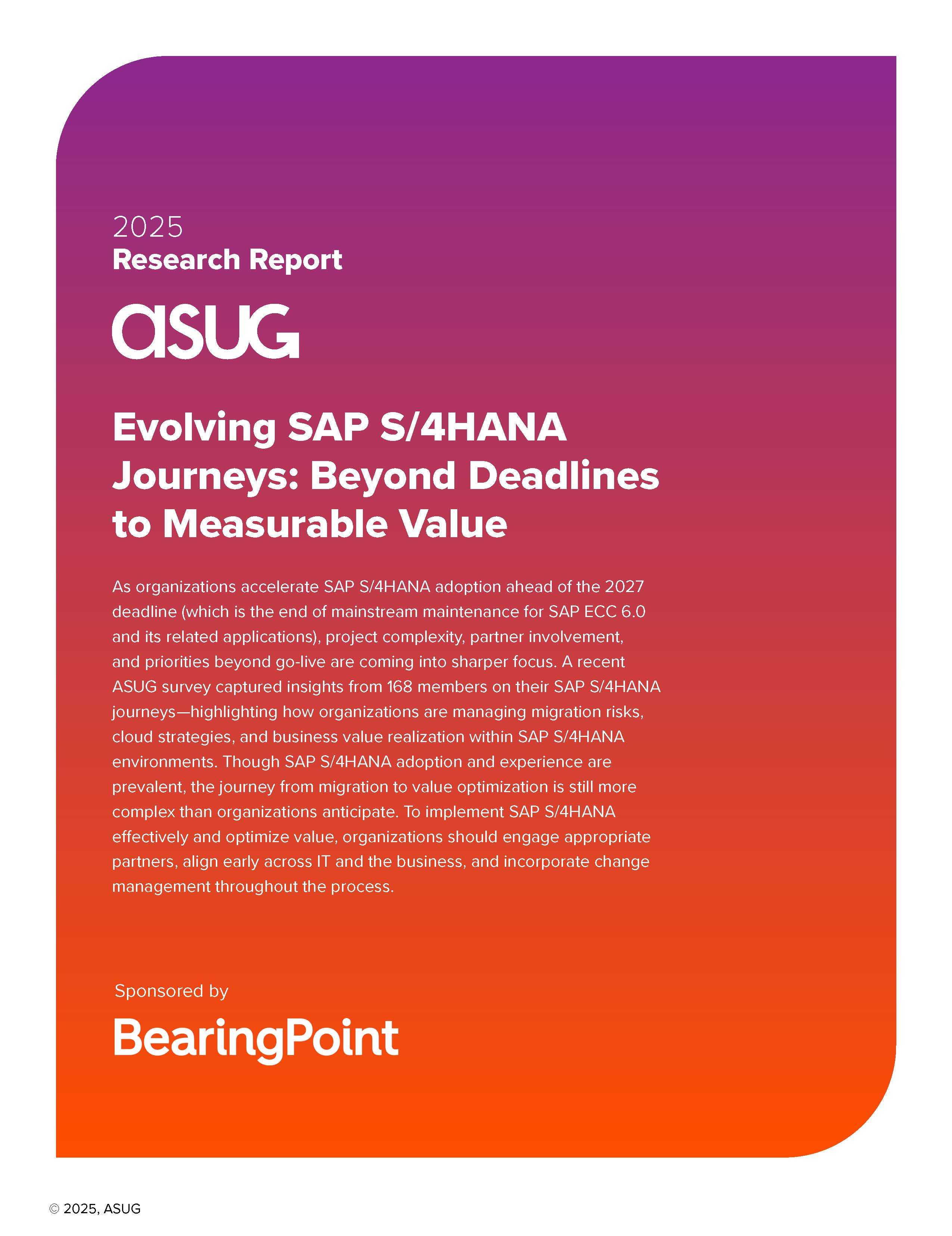 In this ASUG research report, Evolving SAP S/4HANA Journeys: Beyond Deadlines to Measurable Value, explores how 168 SAP customers are tackling complex projects, managing risk, and shifting focus toward long-term outcomes.