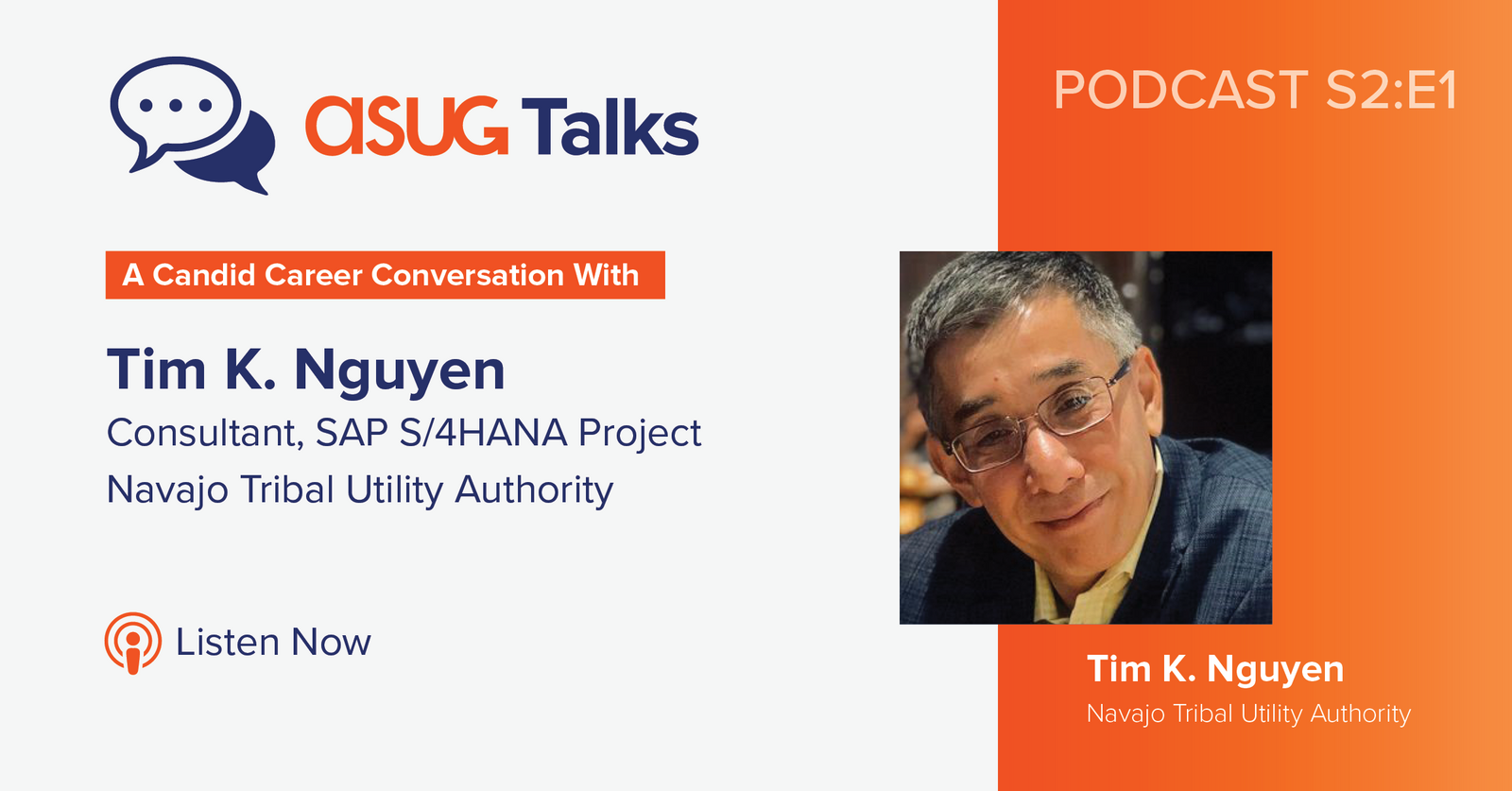I am joined today on ASUG Talks by Tim Nguyen, who is a consultant for the SAP S/4HANA Digital Transformation Project and project member of the PMO at the Navajo Tribal Utility Authority or NTUA. Thank you, Tim, for joining us today on ASUG Talks. We're going to have a candid career conversation, and we're going to take a step back first. Let's begin our conversation with a little bit of your background. Where did you grow up? Tell us a little bit about that, and did that affect who you became as a professional? And if so, how?