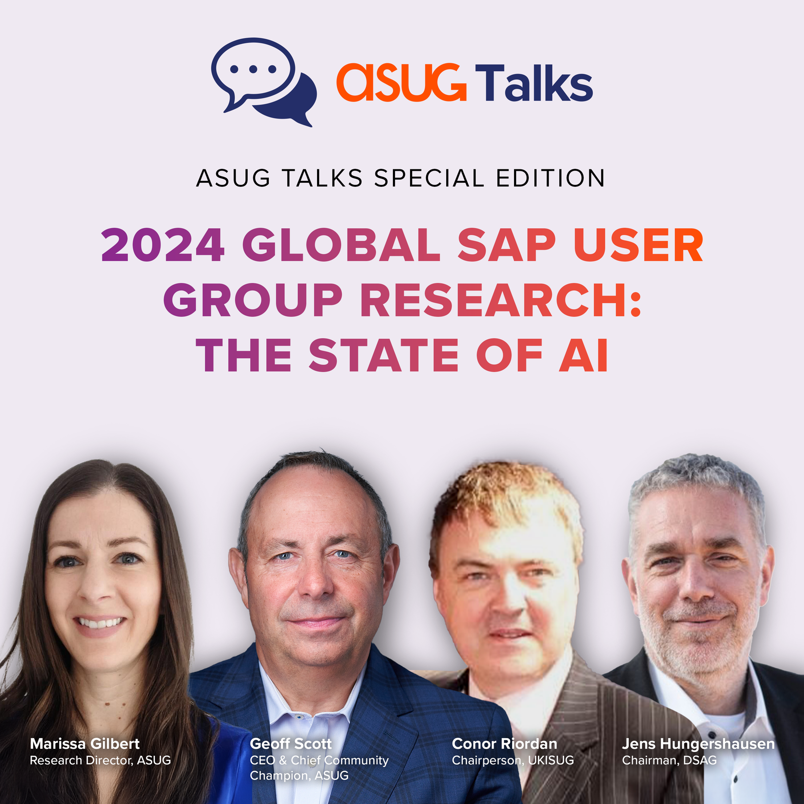 In this roundtable conversation, ASUG Research Director Marissa Gilbert is joined by Geoff Scott, CEO & Chief Community Champion at ASUG; Conor Riordan, Chairperson at UKISUG; and Jens Hungershausen, Chairman at DSAG. The four thought leaders break down the research's highlights and key findings and discuss the impact of AI across the SAP ecosystem.