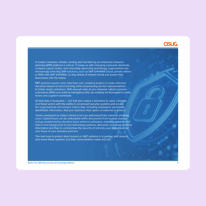 In this exclusive eBook from bowbridge Software and ASUG, gain expert insights into the state of SAP cybersecurity and learn why it's critical to implement a solution specifically tailored for SAP applications to protect against increasingly sophisticated, SAP-skilled malicious actors.