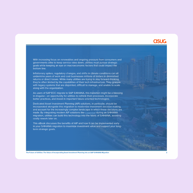Dedicated Asset Investment Planning (AIP) solutions, in particular, should be incorporated alongside your usage of and migration to S/4HANA to modernize investment decision making, and account for the increasingly complex landscape in which these decisions are made. By integrating modern AIP solutions like Copperleaf, utilities can build this technology into the fabric of S/4HANA, avoiding costly rework later on.