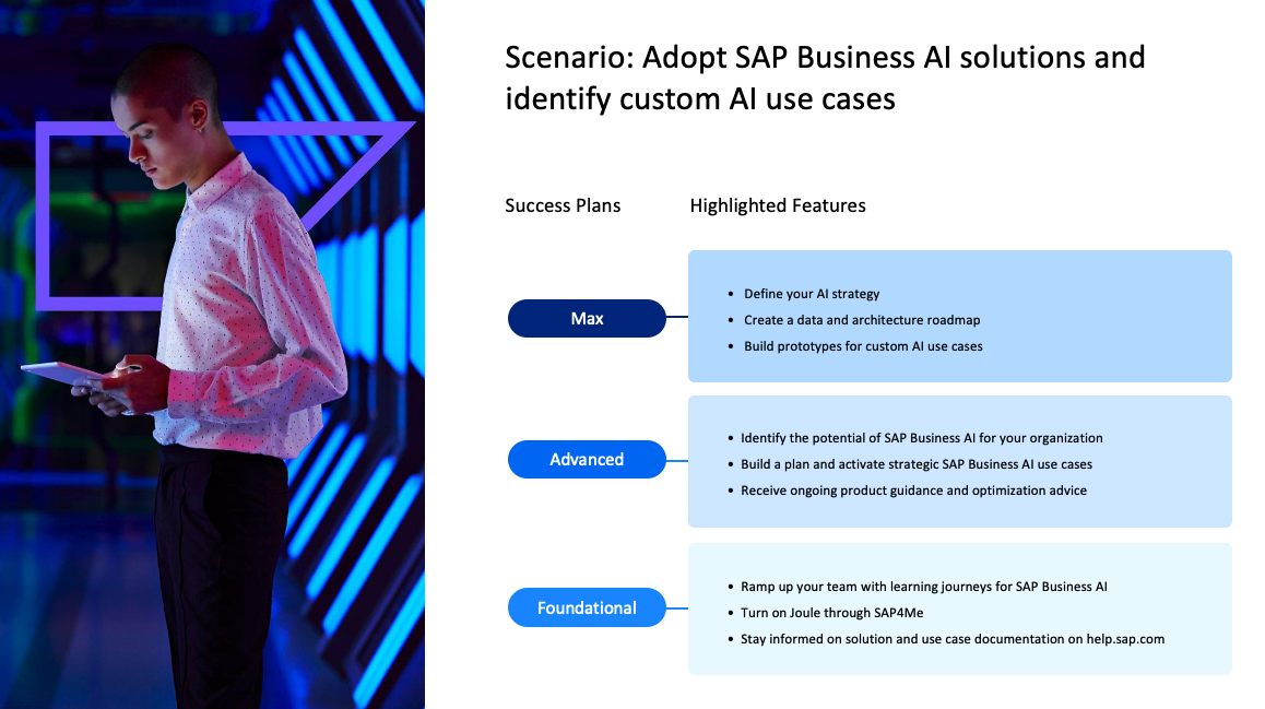 Scheffler shared a scenario of a company adopting SAP Business AI solutions and needing to identify custom AI use cases. If they went with a Foundational plan, it would help ramp up their team with learning journeys for SAP Business AI and turn on Joule through SAP and Me.