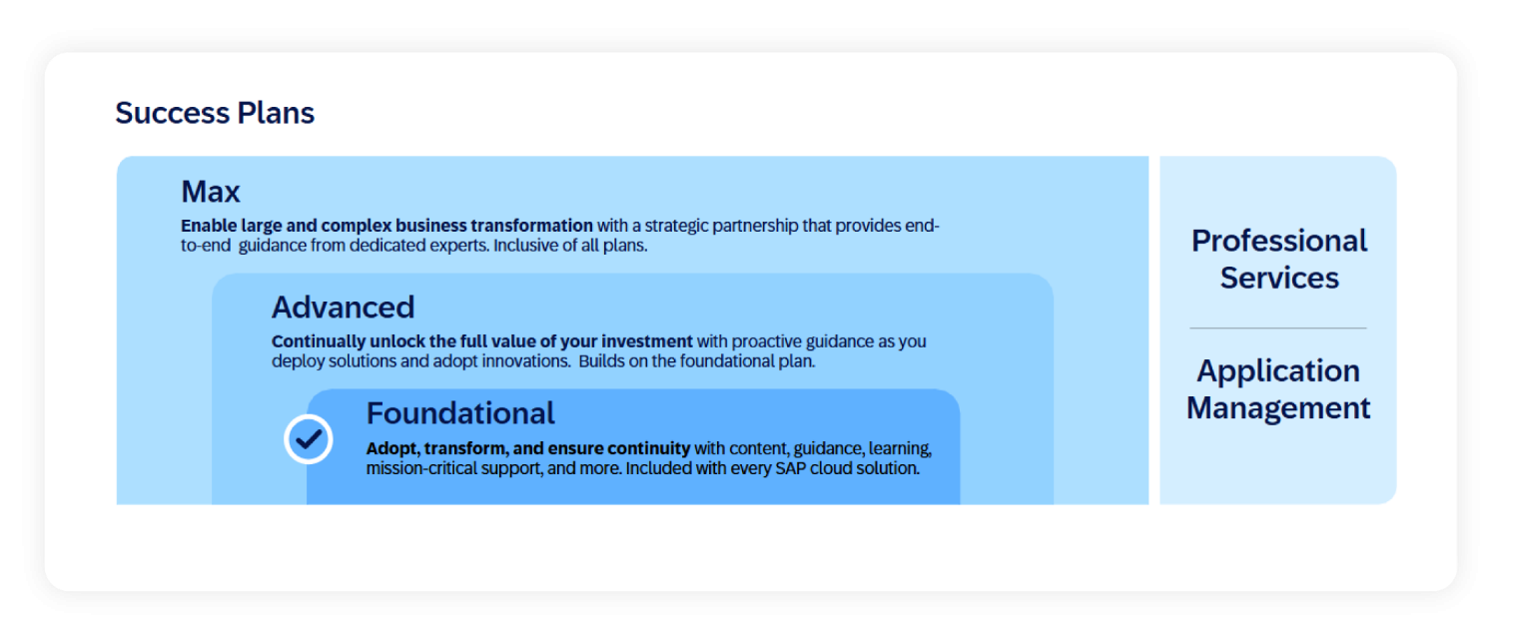 The first level of service is Foundational, which keeps up with mission-critical support service-level agreements (SLAs), provides guidance for SAP Cloud ALM, features self-guided learning journeys, contains embedded launch activities and onboarding resources, and more.